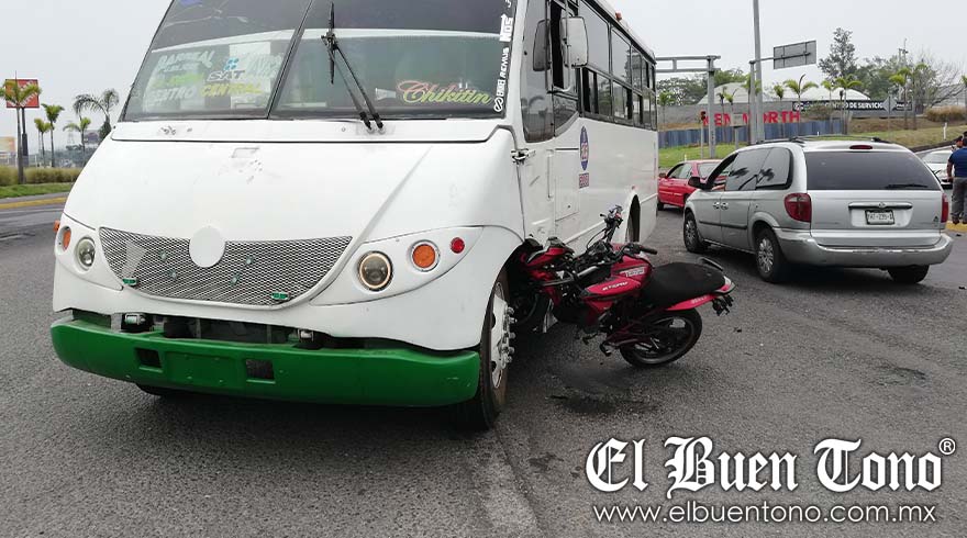 En este caso, una motocicleta conducida por David Hernández Aguilar, de 21 años y residente en la colonia La Antorcha, chocó contra la parte delantera del autobús, provocando que quedara incrustado en la llanta.