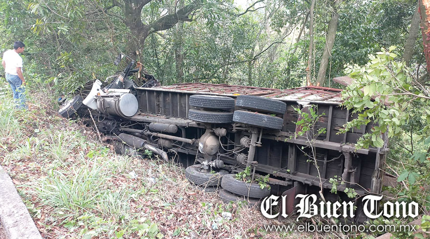 El accidente ocurrió durante la mañana del sábado, cuando el operador del camión de carga al desplazarse sobre la mencionada carretera Estatal, perdió el control en un tramo de curva lo que ocasionó que se saliera del camino y terminara volcado.