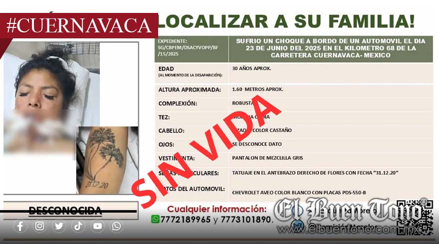 La mujer, de complexión robusta, 1.60 metros de estatura, tez morena clara y cabello rizado castaño, vestía un pantalón de mezclilla gris al momento del accidente. Como seña particular, tenía un tatuaje en el antebrazo derecho con flores y la fecha “31.12.20”.