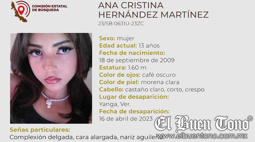 Yanga.-Una menor de 13 años de edad, identificada como Ana Cristina Hernández Martínez, se encuentra como desaparecida desde el día de ayer domingo. Familiares y amigos están solicitando la ayuda de las autoridades policiacas y de la ciudadanía en general para localizarla sana y salva. La menor como seña particular, es de complexión delgada, cara alargada, nariz aguileña. La Comisión Estatal de Búsqueda de Personas desaparecidas ya emitió su alerta a las diferentes corporaciones.