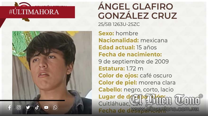 Cuitláhuac, Ver.- Un menor identificado como Ángel Glafiro González Cruz, de 15 años de edad, está reportado como desaparecido desde el día 23 del presente mes.