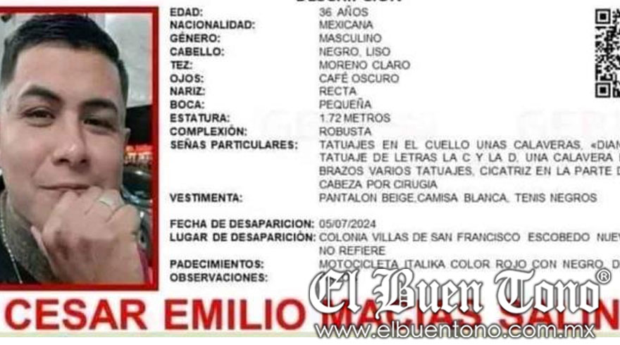 César Emilio fue visto por última vez el pasado 5 de julio en calles de la colonia Villas de San Francisco, en el municipio de Escobedo, a bordo de una motocicleta Italika de color rojo con negro. Según sus familiares, César Emilio salió de su casa alrededor de las 10:00 horas para cobrar un finiquito en una empresa donde laboraba; sin embargo, ya no regresó a su hogar.