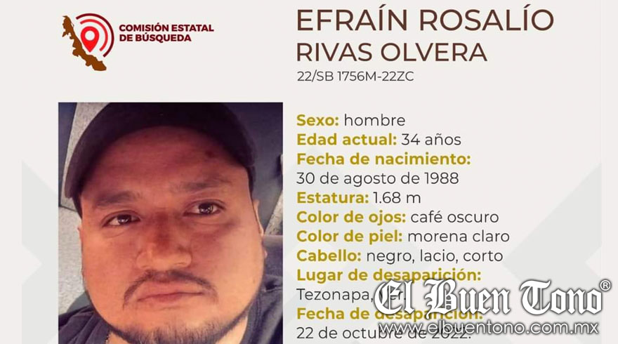 Tezonapa.- Otro habitante de Tezonapa fue reportado ante la Comisión Estatal de Búsqueda de Personas Desaparecidas. Se trata de Efraín Rosalío Rivas Olvera de 34 años de edad, el cual como seña particular tiene un tatuaje en la espalda y otro en el brazo derecho, mide 1.68 metros de estatura, es de color de ojos café oscuro, color de piel morena clara, cabello negro lacio corto, desapareció en este municipio y cualquier información que pueda ayudar a su localización, familiares piden sea reportado a través del número de emergencias 911.