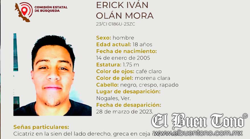Nogales.- Ante la Fiscalía de Desaparecidos asentada en Orizaba, acudió una familia para denunciar de manera oficial la ausencia de Erick Iván Olán Mora, quien fue visto por última vez desde el pasado 28 de marzo del año que transcurre.