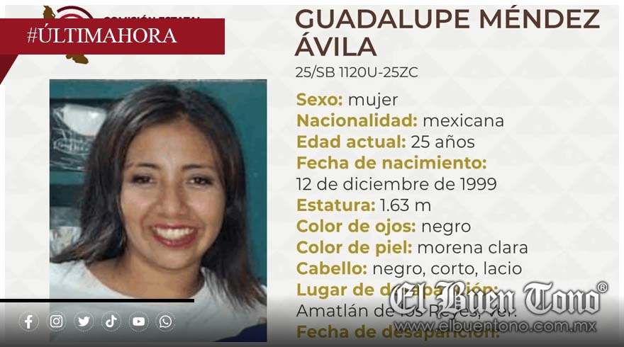 Amatlán, Ver. – Una joven llamada Guadalupe Méndez Ávila, de 25 años de edad, fue reportada como desaparecida desde el 22 de julio.