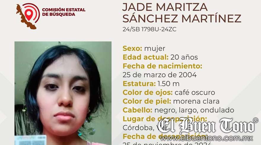 Córdoba, Ver.- Una joven identificada como Jade Maritza Sánchez Martínez, de 20 años de edad, es reportada como desaparecida desde este lunes 25 de noviembre.