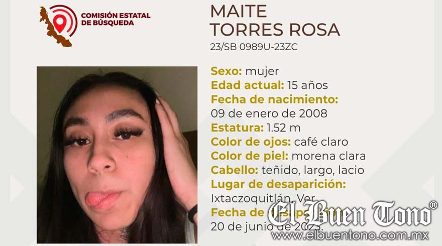 A nombre de Maite Torres Rosa responde la desaparecida de tan solo 15 años de edad, misma que lleva tres días sin regresar a su hogar por lo que las personas que la conocen la buscan físicamente y a través de las redes sociales.