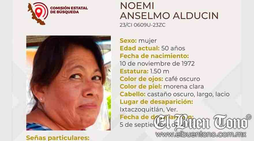 Ixtaczoquitlán, Ver. – Una mujer de 50 años de edad, identificada como Noemí Anselmo Alducin, se encuentra desaparecida desde el pasado 5 de septiembre.