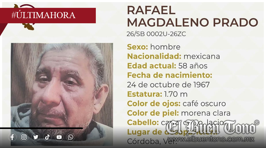 Córdoba, Ver.- Rafael Magdaleno Prado, un hombre de 58 años, está siendo buscado por sus familiares, ya que desde el 3 de este mes se encuentra desaparecido.