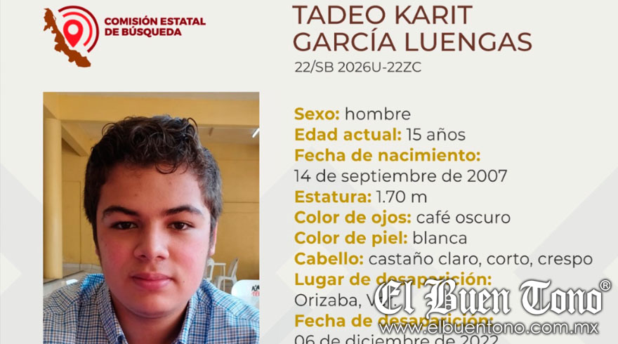 Orizaba.- Un menor de 15 años de edad, identificado como Tadeo Karit García Luengas, se encuentra como desaparecido. La Comisión Estatal de Búsqueda de Personas Desaparecidas ya emitió su alerta a las diferentes corporaciones para tratar de localizarlo, familiares piden la ayuda de las autoridades y de la ciudadanía para localizarlo sano y salvo.