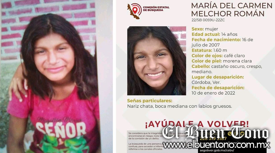 Córdoba.- Una adolescente de nombre María del Carmen Melchor Román, de 14 años de edad, es buscada por familiares, así como por el personal de la Comisión Estatal de Búsqueda de personas desaparecidas ya que han transcurrido cuatro días desde su desaparición ocurrida en la ciudad de Córdoba.