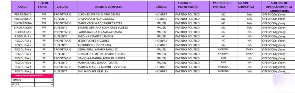 En las regidurías figuran Laura Karina Lezama Miranda y Jesús Flores Vázquez (Movimiento Ciudadano), Denia Abril Amaro Sánchez y Martín Manuel Montiel Victoria (Morena), así como Daniela Amanda Aguilar Huerta (PAN). La composición refleja una distribución plural de fuerzas políticas, aunque el proceso de validación por parte del OPLE podría modificar la lista definitiva antes de su toma de protesta.
