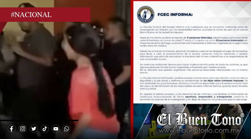 Irapuato, Guanajuato . — La Fiscalía General del Estado de Guanajuato informó que al menos 11 personas murieron y 20 resultaron heridas en un ataque armado ocurrido la noche del martes durante una fiesta patronal en un domicilio de Irapuato.