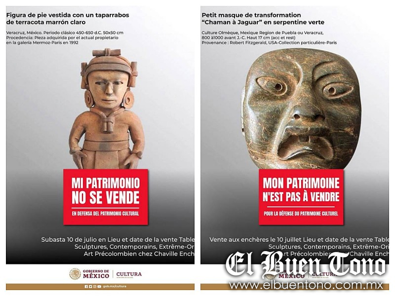 Mediante un comunicado, la Secretaría de Cultura informó que en la subasta de hoy titulada “Tableaux, Sculptures, Contemporains, Extrême-Orient, Art Précolombien chez Chaville Enchères” se ofertarán los dos bienes que, de acuerdo con el dictamen de especialistas del INAH, “son monumentos arqueológicos que forman parte del patrimonio cultural de la Nación mexicana, definidos y protegidos por la Ley Federal sobre Monumentos y Zonas Arqueológicos, Artísticos e Históricos”.