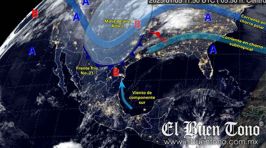 Nacional.- Hoy domingo, 5 de enero el frente frío No. 21 avanza sobre el norte y noreste del país, interactuando con la corriente en chorro polar. Este fenómeno ocasionará vientos con rachas de hasta 60 kilómetros por hora (km/h), acompañados de posibles tolvaneras en estas regiones.