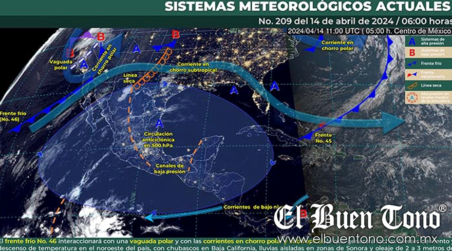 Nacional.- El Servicio Meteorológico Nacional (SMN) de la Comisión Nacional del Agua (Conagua) ha anunciado este domingo la llegada del frente frío número 46 al noroeste de México, que en interacción con una vaguada polar y las corrientes en chorro polar y subtropical, traerá consigo una serie de fenómenos meteorológicos adversos. Entre estos se incluyen fuertes rachas de viento, un notable descenso en las temperaturas, chubascos y lluvias aisladas, afectando principalmente a las regiones de Sonora y Baja California.