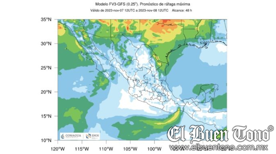 Asimismo, se esperan rachas de viento de 60 a 80 km/h, con la posibilidad de formación de torbellinos o tornados en Chihuahua, Coahuila, Nuevo León y Tamaulipas. Además, se prevén rachas de viento de 40 a 60 km/h con posibles tolvaneras en Baja California, Sonora y Durango.