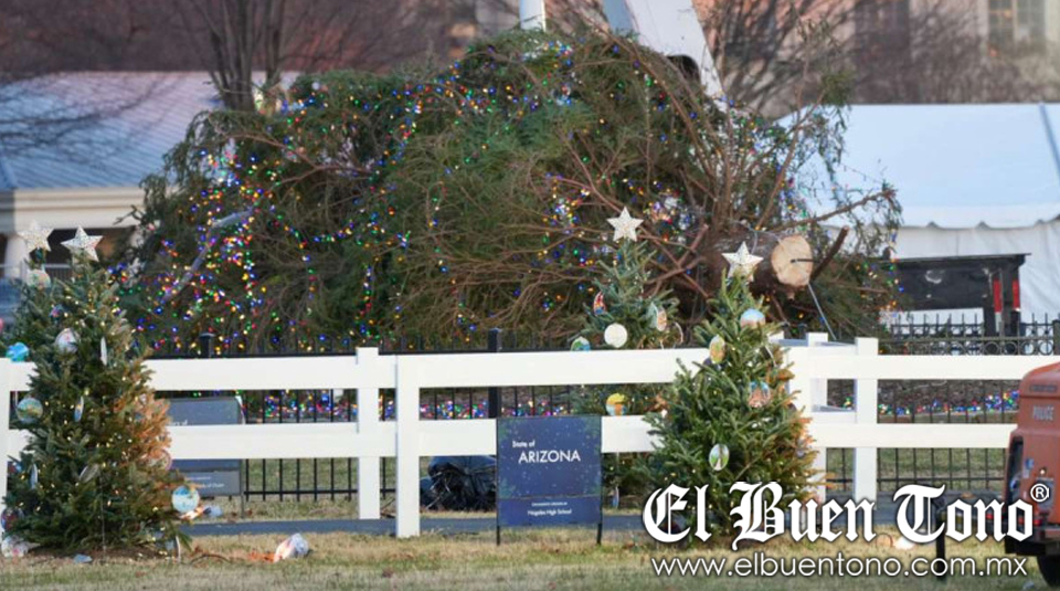 EEUU.- Durante la tarde-noche del martes, el emblemático Árbol Nacional de Navidad en la Casa Blanca sufrió un inesperado desplome debido a fuertes vientos, según informaron funcionarios. Aproximadamente a las 17:00 horas, el árbol yacía de costado con sus luces aún brillando, mientras una grúa se elevaba sobre él detrás de una valla blanca. Las autoridades mantuvieron alejados a transeúntes y medios de comunicación durante la operación de recuperación.