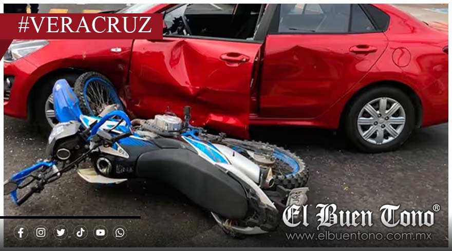 El percance ocurrió sobre la avenida Cuauhtémoc, en dirección de sur a norte, justo al llegar al cruce con la calle Alcocer. En ese punto, una motocicleta Italika DM 250 modelo 2022, color azul con blanco y con placas 24YJR4 del estado de Veracruz, se impactó contra un automóvil Kia Río modelo 2023, color rojo y con placas YLB783B, también del estado.