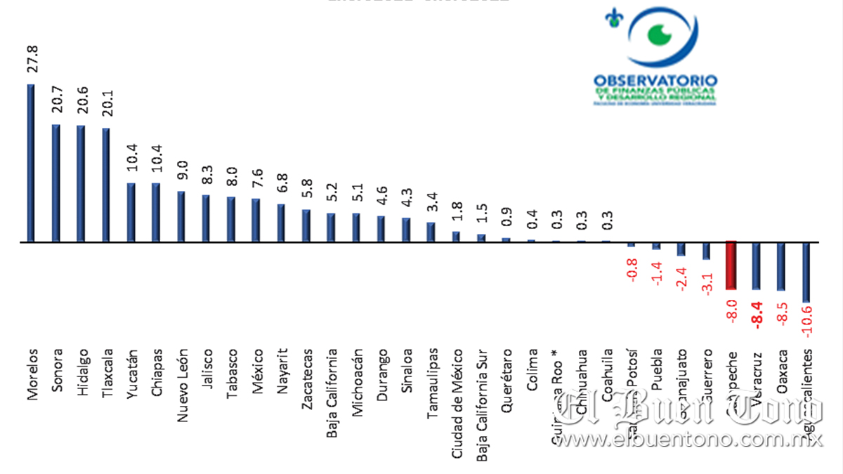 “Observándose que otras entidades federativas mostraron un desempeño muy superior, como es el caso de Morelos que creció 27.8 por ciento, Sonora 20.7. Hidalgo 20.6 y Tlaxcala 20.1 por ciento, sólo por mencionar los cuatro de mejor comportamiento, pero en realidad la mayoría de las entidades federativas tuvieron crecimiento en este período”.