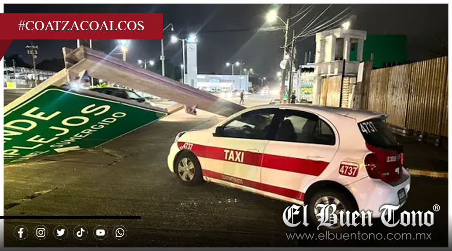 Coatzacoalcos, Ver.– Un taxi con número económico 4738 sufrió daños significativos este martes 21 de enero, cuando un señalamiento vial cayó sobre la unidad debido a los intensos vientos generados por el Frente Frío número 24. El incidente ocurrió en la avenida Transístmica, una de las principales arterias de la ciudad.