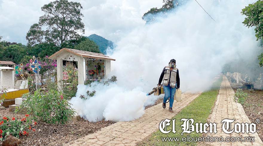 Ixtaczoquitlán.- En el marco de la celebración de Todos Santos y Fieles Difuntos, el ayuntamiento redobló esfuerzos en la fumigación y aplicación de larvicida en los 10 panteones del municipio, a fin de prevenir la propagación del mosquito transmisor del dengue.
