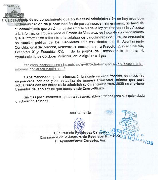 La respuesta de la Encargada de Recursos Humanos, C.P. Patricia Rodríguez Campos, fue un monumento a la simulación. En el oficio JRH/0326/2026, la funcionaria argumentó que “en la actual administración no hay área con antecedentes de Coordinación de parquímetros” y remitió al ciudadano a una liga genérica del portal de obligaciones de transparencia.