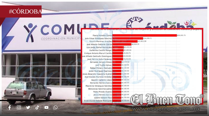 Córdoba, Ver.– El Ayuntamiento de Córdoba destina $103,573.37 (ciento tres mil quinientos setenta y tres pesos con treinta y siete centavos) quincenales, equivalentes a $207,146.74 (doscientos siete mil ciento cuarenta y seis pesos con setenta y cuatro centavos) mensuales, para cubrir la nómina de la Coordinación Municipal del Deporte (Comude) y del director de Educación, Cultura y Deporte. Entre los beneficiarios se encuentra Flavio Heredia Quiroz, quien percibe $30,201.75 (treinta mil doscientos un pesos con setenta y cinco centavos) quincenales, lo que representa $60,403.50 (sesenta mil cuatrocientos tres pesos con cincuenta centavos) mensuales, y el coordinador municipal del deporte, Rosalío Martínez Armillas, con $11,811.90 (once mil ochocientos once pesos con noventa centavos) quincenales, equivalentes a $23,623.80 (veintitrés mil seiscientos veintitrés pesos con ochenta centavos) mensuales, señalado como un aviador que rara vez se presenta a trabajar.