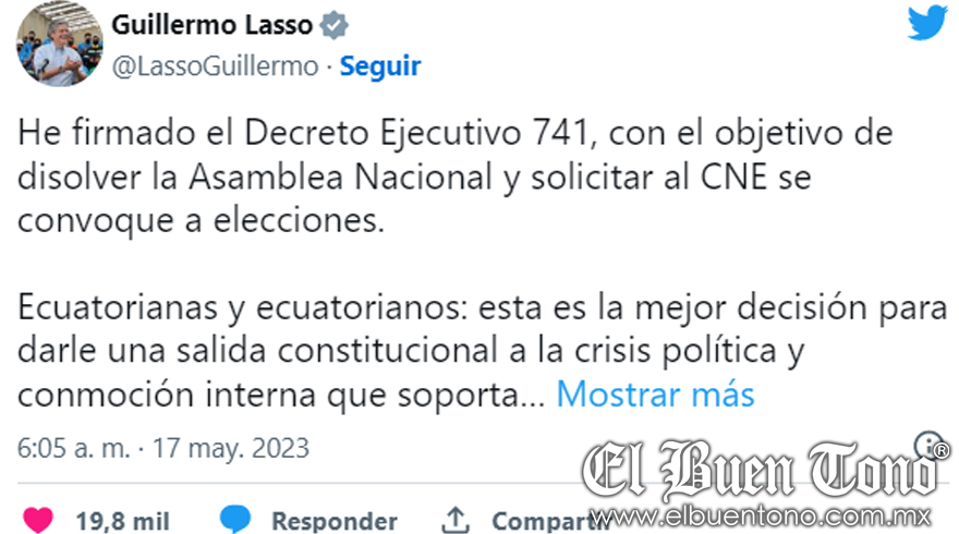 Ecuador.- El presidente de Ecuador, Guillermo Lasso, decretó la disolución de la Asamblea Nacional argumentando que hay una “grave crisis política” derivada del juicio político contra él, con un Parlamento que, a su juicio “tiene como proyecto político la desestabilización del Gobierno, de la democracia y del Estado”.