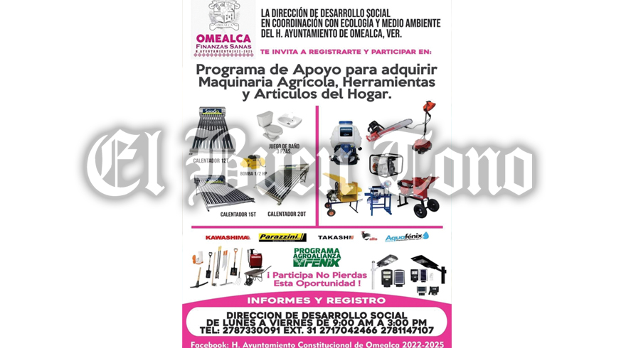 Omealca.- Gracias a la gestión de la presidenta municipal, Dra. Nallely Cortés Jiménez, desde ayer se abrió el padrón de inscripción para apoyos productivos como son maquinaria agrícola, herramientas y artículos para el hogar. Para solicitar informes los interesados deberán acudir a las oficinas del Desarrollo Social en horario de 9:00 am a 3:00 pm o a los teléfonos 2787330091 ext. 31 o 2717042466/2781147107.
