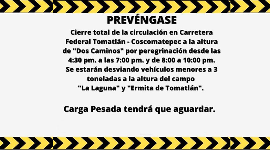 Coscomatepec.- Derivado de las peregrinaciones guadalupanas previstas esta tarde sobre la carretera federal Fortín-Huatusco, entre la comunidad de Dos Caminos y la cabecera de Coscomatepec, se prevé el cierre de la circulación a partir de las 16:30 horas, por lo que invitan a automovilistas a circular con precaución y tomar vías alternas por Chocamán-Calaquioco, debido al congestionamiento vehicular durante al menos 6 horas.