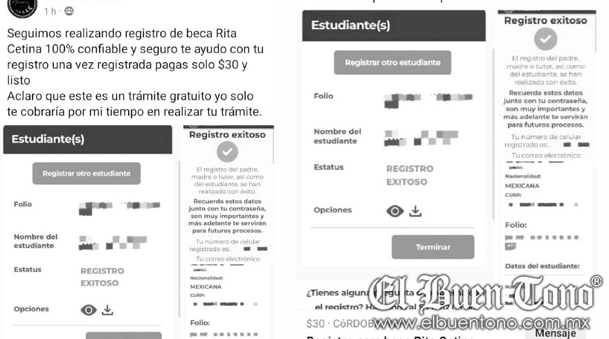 Córdoba.- En Córdoba, a través de redes sociales y grupos locales, han surgido ofertas de servicios para gestionar la inscripción a la beca Rita Cetina, destinada a estudiantes de nivel básico.