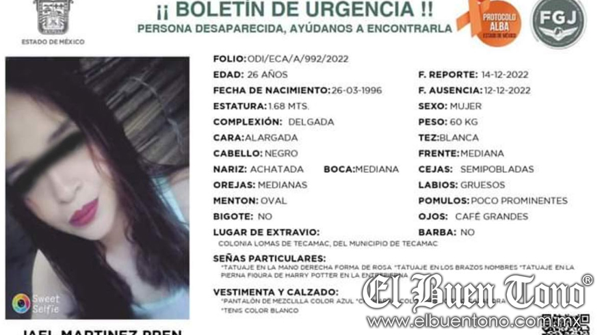 EDOMEX.- La familia de Jael “N” la buscaba desde el pasado 14 de diciembre, dos días después de que no regresó a su casa; la mujer de 26 años salió de su domicilio en la colonia Lomas de Tecámac, en el municipio de Tecámac, Estado de México y no volvió.