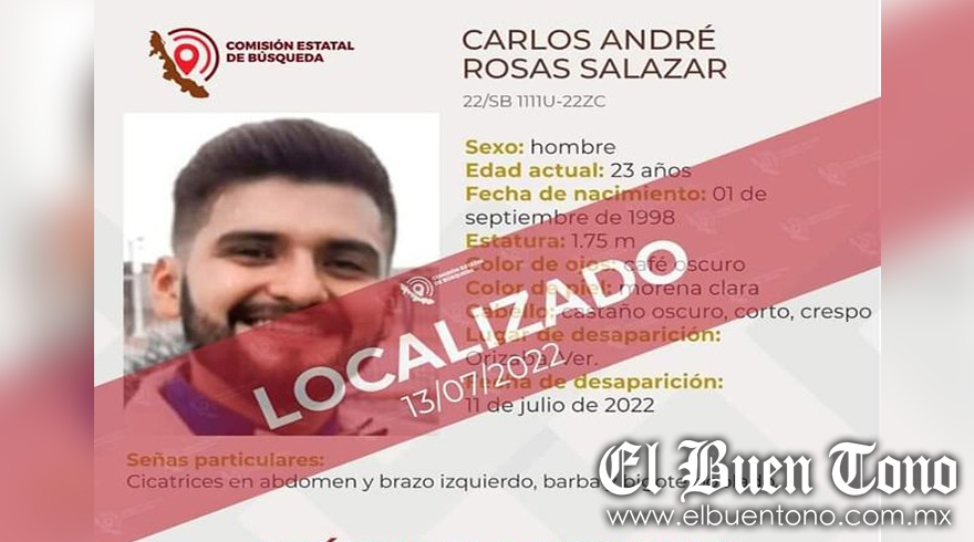 ORIZABA.- La tarde de ayer, la Comisión Estatal de Búsqueda de Personas Desaparecidas dio a conocer que el técnico en atención médica prehospitalaria de Cruz Roja delegación Córdoba, Carlos Andrés Rosas Salazar, fue localizado sano y salvo.