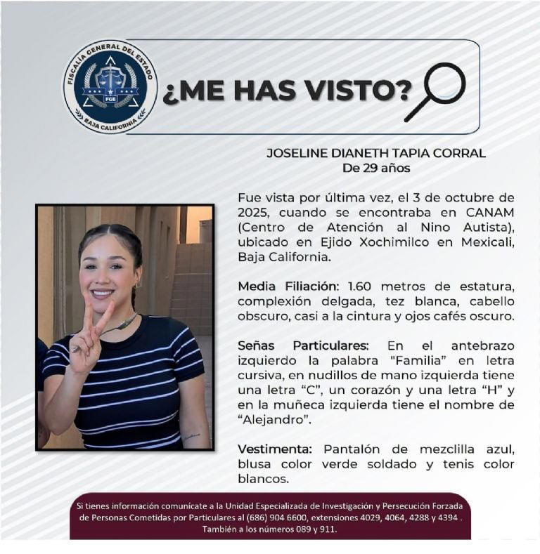 Baja California.- La joven Joseline Dianeth Tapia Corral, de 29 años, fue encontrada sin vida en el canal Tulichek, a la altura del fraccionamiento Residencial en Mexicali, después de haber sido reportada como desaparecida el viernes 3 de octubre. Según la Fiscalía General del Estado de Baja California (FGE), la víctima habría sido lanzada viva al canal y murió por asfixia por ahogamiento.