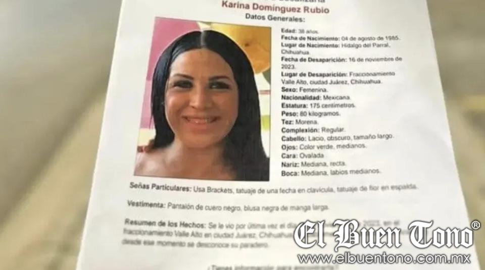 Ciudad Juárez.- Después de 13 días de estar desaparecida, Karina Rubio Domínguez, activista de 36 años, fue encontrada sin vida el pasado miércoles 29 de noviembre en Ciudad Juárez. La Fiscalía Especializada de la Mujer informó que su cuerpo fue hallado enterrado en una fosa clandestina en el norponiente de la ciudad, en una propiedad utilizada como yonke