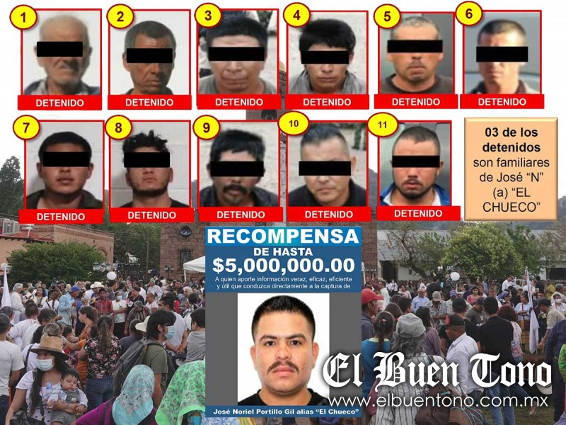 CDMX.- Durante los operativos realizados para dar con el presunto asesino de los dos sacerdotes jesuitas y un guía turístico, Juan “N”, “El Chueco”, las autoridades federales y locales lograron aprehender a 11 personas ligadas a éste, entre ellas, tres familiares del sospechoso.