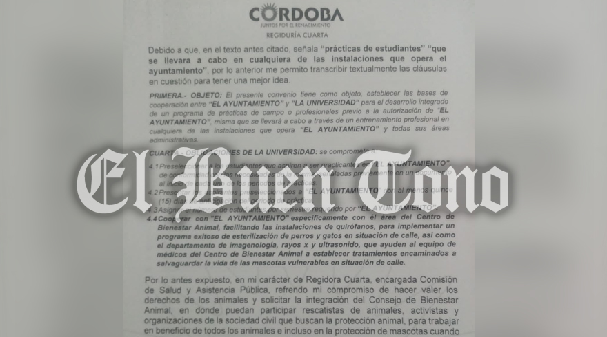 Córdoba.- Luego de que el Ayuntamiento diera a conocer mediante un boletín, que la firma del convenio en el que se permitía a estudiantes de una universidad particular la realización de prácticas con perros y gatos del Centro de Bienestar Animal (CBA) eran tan sólo “noticias de desinformación”, la regidora Cuarta, María Luisa Martínez Ramírez, externó mediante un documento, su posicionamiento al respecto, manifestando que en dicho acuerdo existe una cláusula que no está del todo clara y que pone en riesgo a los animales que están en resguardo.