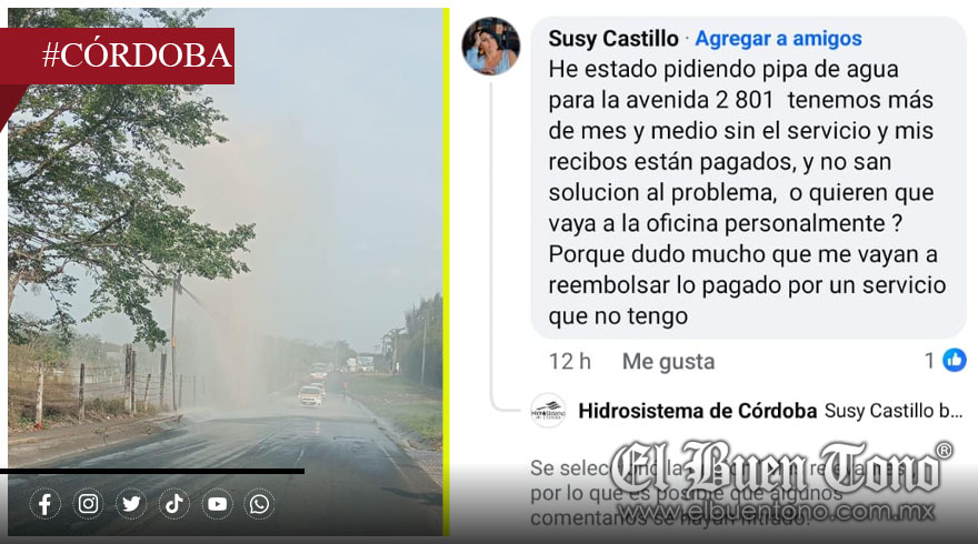 Córdoba, Ver.- Tras una grave fuga en la carretera a Cerezos, y que la reparación dejó sin agua a decenas de familias de diversas localidades, Hidrosistema de Córdoba optó por cerrar los comentarios en sus redes sociales, evitando así el flujo de quejas ciudadanas que diariamente exigen soluciones.