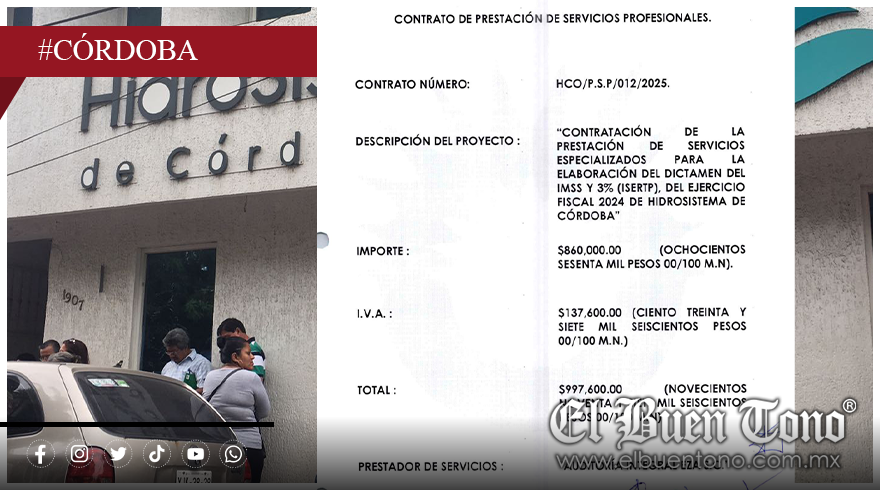 Córdoba, Ver.- El organismo público descentralizado Hidrosistema de Córdoba celebró un contrato por $997,600.00 pesos con la empresa Auditoría Integral EZA S.C., un despacho que actualmente es investigado por la Auditoría Superior de la Federación (ASF) por su presunta participación en un esquema de desvío de 25 millones de pesos en el Poder Judicial de Veracruz.