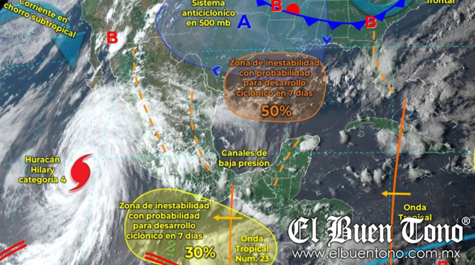 El pronóstico del clima para hoy prevé que la amplia circulación del huracán “Hilary” junto a los efectos del monzón mexicano provocará lluvias muy fuertes a intensas en el noroeste y occidente de la República Mexicana, además de la Península de Baja California, además de rachas intensas de viento y oleaje elevado en Sonora, Sinaloa, Nayarit y Jalisco.