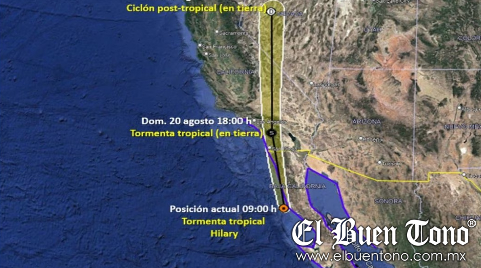 De acuerdo con el SMN, “Hilary” ahora es una tormenta tropical y se localiza muy cerca de Cabo San Quintín, B.C., sus extensas bandas nubosas mantienen la probabilidad de lluvias muy fuertes a puntuales intensas en la Península de Baja California y el noroeste del país.