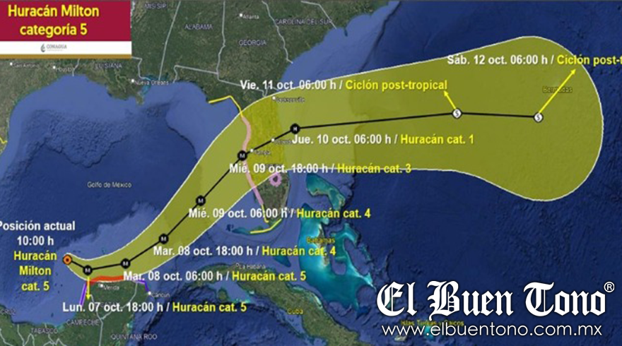 México.-. El huracán Milton, ahora de categoría 5, se acerca peligrosamente a las costas de Yucatán, con previsión de impacto cercano al puerto de Progreso. Ante esta situación, el gobernador Joaquín Díaz Mena anunció la suspensión de clases y actividades no esenciales a partir del mediodía de este lunes, además de la imposición de ley seca en todo el estado desde las 17:00 horas. Las zonas costeras ya comenzaron a ser evacuadas debido a los fuertes vientos y alto oleaje.