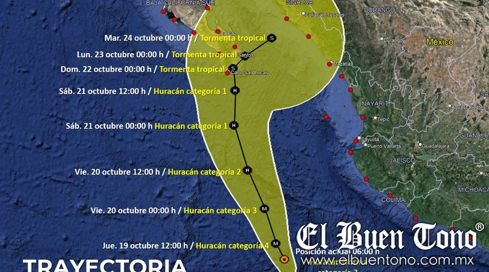 Pronóstico: Según el Servicio Meteorológico Nacional (SMN), se espera que “Norma” alcance la categoría 4 de huracán durante la tarde de este jueves 19 de octubre. Sin embargo, en los días siguientes, se pronostica que perderá fuerza y podría degradarse a la categoría 1. Se espera que toque tierra cerca de Cabo San Lucas como tormenta tropical el domingo 22 de octubre.