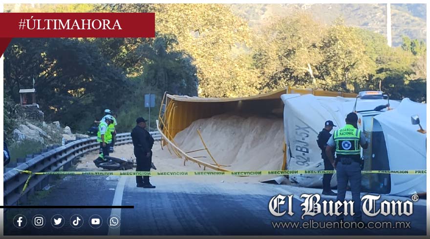 De acuerdo con los reportes oficiales, el accidente ocurrió cuando el conductor de un tráiler Kenworth blanco con doble remolque, cargado con granos, perdió el control al intentar frenar de emergencia tras acercarse a una motocicleta que circulaba frente a él. La maniobra provocó que la pesada unidad volcara aparatosamente, impactando a los ocupantes de la moto.