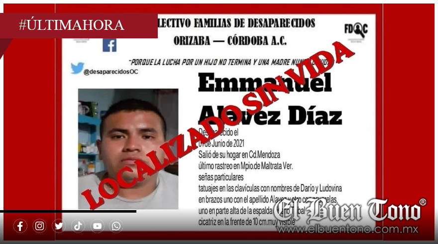 Emmanuel Alavez Díaz, reportado como desaparecido desde el 1 de junio de 2021, finalmente fue localizado, aunque sin vida, luego de más de cuatro años de búsqueda por parte de su familia y colectivos de personas desaparecidas en la región Orizaba–Córdoba.