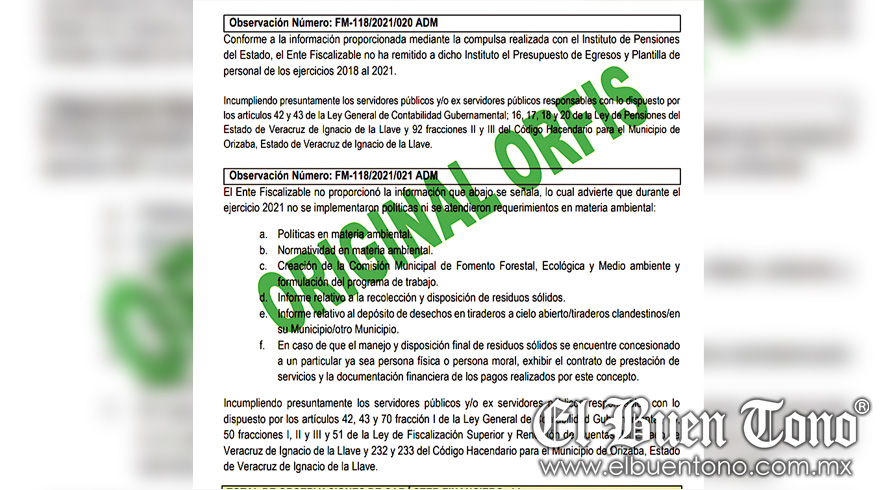 Orizaba.- La administración orizabeña en 2021 no cumplió con las políticas en materia ambiental, por lo que el Orfis le interpuso la Observación Número: FM-118/2021/021 ADM en el Informe de Resultados de la Cuenta Pública.