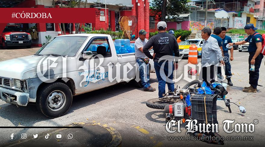 Córdoba.- Con una herida en el pie derecho resultó un hombre de 55 años, que manejaba una motocicleta, la cual fue impactada por una camioneta repartidora de garrafones de agua, al circular sobre el bulevar Miguel Alemán, justo enfrente de las instalaciones del cuerpo de bomberos de Córdoba.