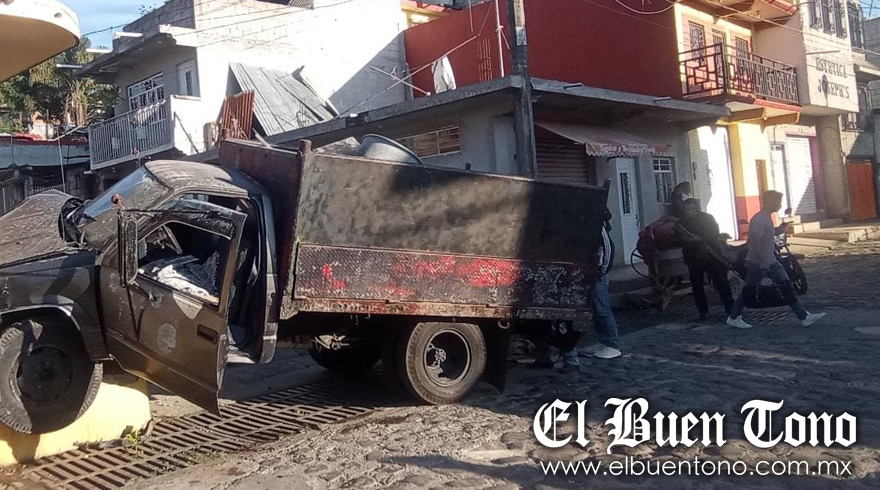 Coscomatepec.- Una unidad propiedad de una constructora, cuando era conducida por personal del Ayuntamiento, que transportaba cinco albañiles se quedó sin frenos sobre la calle Ames y Argüelles, esquina Manuel Doblado del Barrio de San Diego, lo que ocasionó que colisionara contra una vivienda.