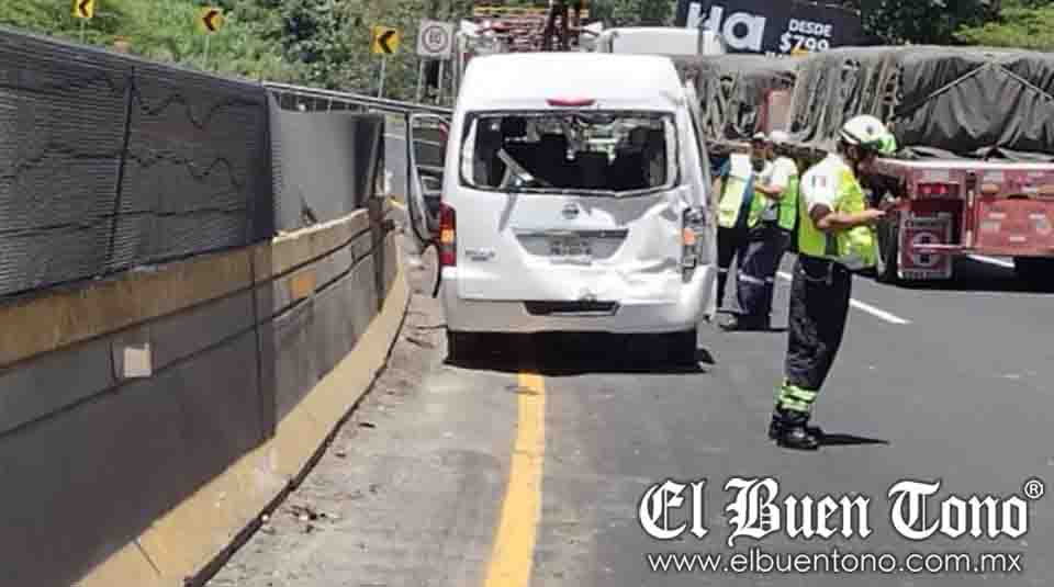 Repentinamente, la vagoneta fue impactada por un tractocamión de carga pesada tipo torton con redilas. El conductor no mantuvo la distancia adecuada, lo que provocó la colisión y dejó ambos vehículos varados en el carril vial.